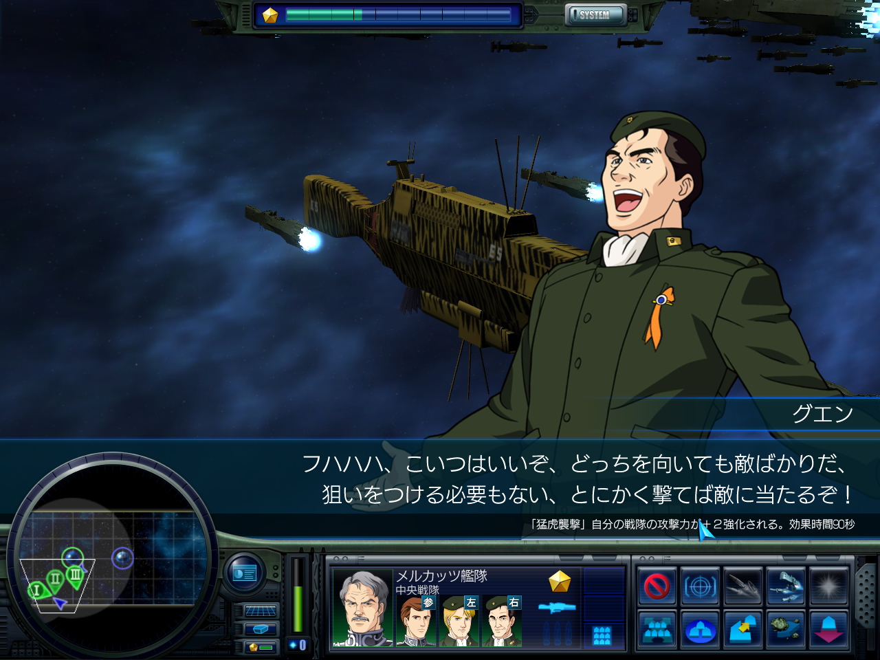 ちなみに,原作ではロイエンタールとミッターマイヤーにやられて死んでしまうグエンだが,グエンのいる艦隊が健在のままステージをクリアすれば,ラップなどと同様,あとのステージでもヤン艦隊で活躍してくれる。