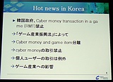 またRMTについて取り締まる法案「ゲーム産業振興法」についても軽く言及し,「このような法案の成立によって,今後,ゲーム内アイテムなどの管理が,ゲーム会社にとって負担になる可能性がある」と説明。氏は「このまま状況が推移して,ゲーム内アイテムが現在のように会社のモノとしてではなく,ユーザーの財産ということになると,サーバーに溜まったデータが,財務表上は“会社の負債”扱いになるかもしれない」と語り,そうなった場合,その管理負担は相当なものになるだろうと解説した。