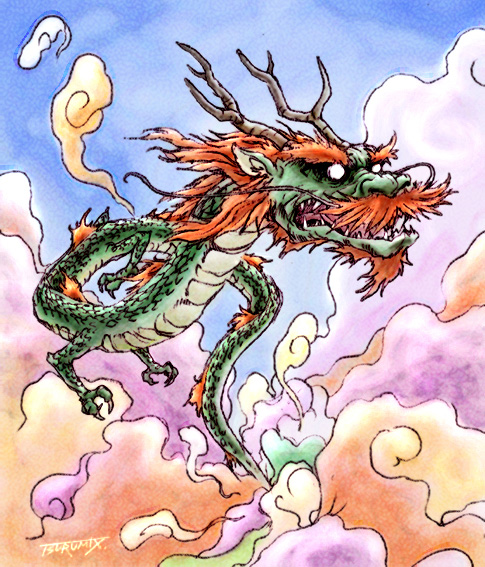 龍といえば,東西南北の海を統治する龍王伝説が有名だ。中国の伝承によれば,世界の海は東海龍王敖広 (ごうこう),西海龍王敖閏 (ごうじゅん),南海龍王敖欽 (ごうきん),北海龍王敖順 (ごうじゅん)という四柱の龍王によって統治されており,彼らは水域を管理したり,天候を操って嵐を起こしたりする。彼らは普段から龍の姿をとっているわけではないようで,通常は人間の姿をとって,海底の水晶宮で魚達と一緒に過ごしているらしい。