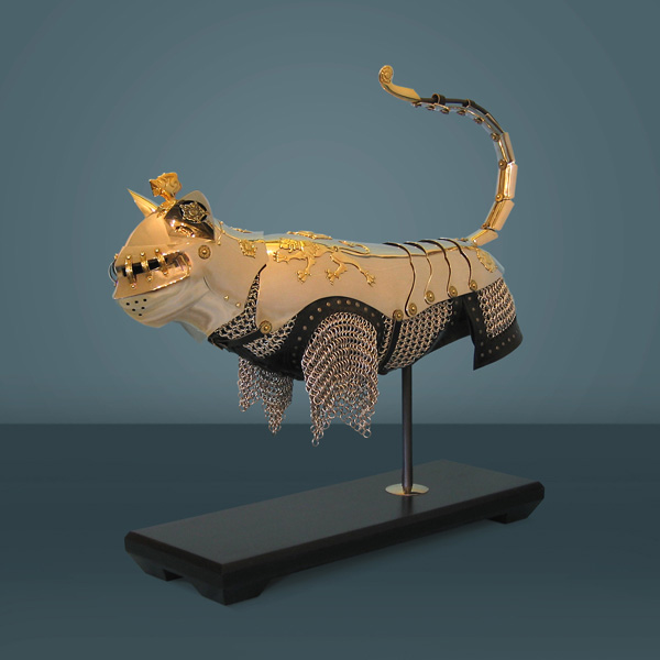 「甲冑や刀剣のレプリカ」は紹介しないと書いたが,この甲冑はどこにでもあるようなものではない。なんと,アーティストの手作りという貴重な「ネコ専用フルプレート・アーマー」なのだ。カナダ在住の板金工芸者Jeff de Boer(ジェフ・デ・ボア)氏が50〜200時間もかけて製作しており,ものによって500ドルから2000ドル(約5〜20万円)ほどの値段が付いているという。