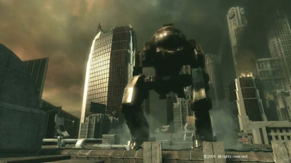 この画像は,アップされたムービーをキャプチャしたものだ。メックらしき機体が人影のない街をのし歩く短いクリップばかりだが,ジェットを使って飛んだり,地面を揺らしながら進んでくる様子が見られる。また,海外ゲーム情報サイトのIGNでは,メックの一つであるWarhammerが戦う壮絶なインゲームシーンを収録したムービーも公開されている