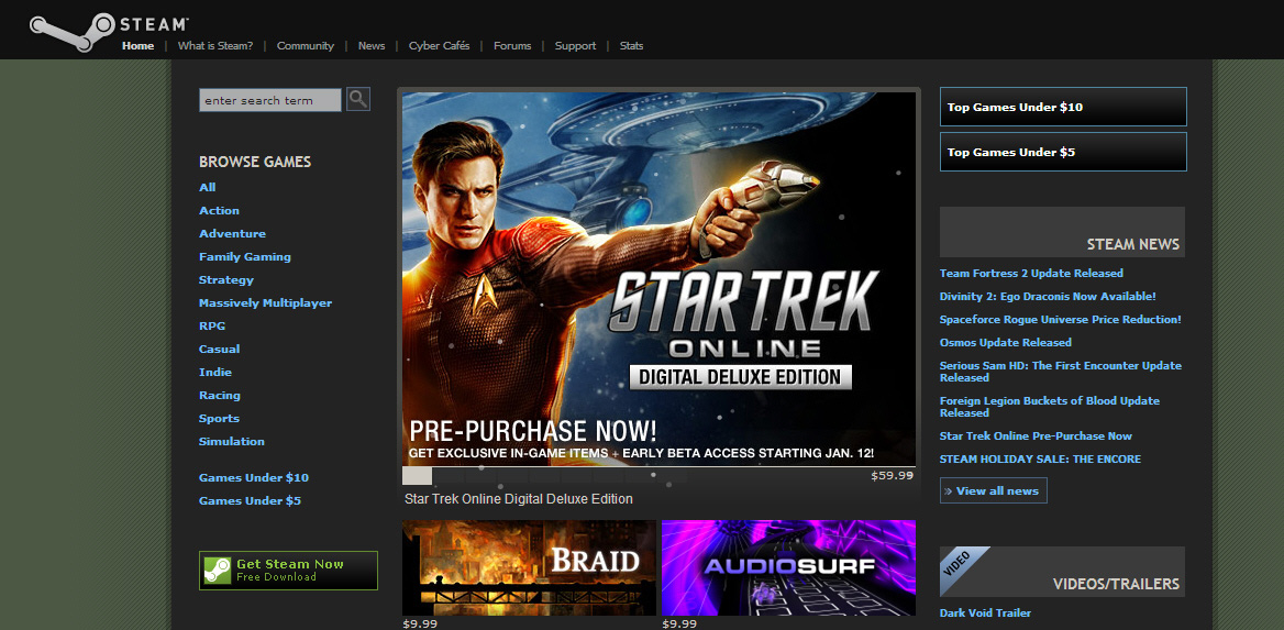 デジタル配信のデパートとも言えるSteamでは,ホリデー期間の激安セールや,メーカーごとのComplete Packのほか,ネットを利用したシステムならではのさまざまなアイデアが見られる。最近では,「Star Trek Online」のように「デジタル・デラックス版」と呼ばれるレアアイテムなどを挿入した特別版の販売や,予約時点での値引き,さらには「Borderlands」のように友人と共同で4本買えば1本分が無料になるというようなサービスが次々に登場している