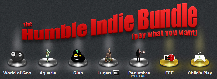 そんな2D Boyを筆頭にいくつかの独立系メーカーが集まり,また面白いことをしたようだ。それは,「ゲームの値段はあなたが決めてください?」の拡大版ともいえるもので,World of Gooを含むインディーゲーム6本がバンドルされたパックを,プレイヤー自身が付けた値段で購入できるというキャンペーンが行われたのだ。