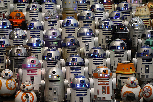 会場のホールに集結したリモコン操作のドロイドの群れ。「ドロイドビルダーズクラブ」なる人々が作った渾身の力作だ