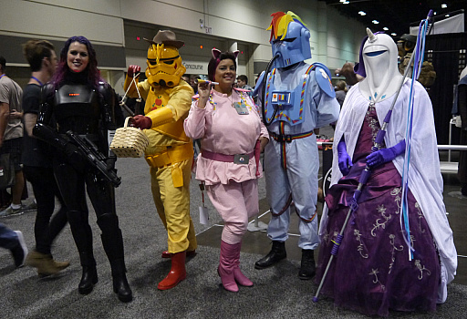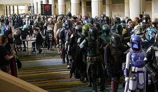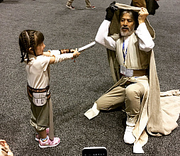 こうしたコスプレイヤーの年齢層が幅広いというのも,イベントの大きな特徴だろう。お父さんがクワイ=ガン・ジンで息子がアナキン・スカイウォーカーという親子や,R2-D2風のコスチュームを着せた赤ん坊をベビーカーに乗せ,レイになった小さな娘の手を引きながら横断歩道を渡る家族,反乱軍パイロットに扮した中年男女の一団など,まるでディズニーランドで定期的に行われる仮装大会を,そのままコンベンションセンターに持ってきたような雰囲気なのだ。