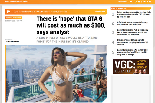 これは,ゲーム情報サイトVGCのキャプチャ画像だ。ゲーム1本100ドルというのは「最大推定値」であり,Rockstar GamesがGTA6の価格つり上げを図っているというわけではないが,これまでの発言内容をみるとあり得る話かもしれない。経営者たちの判断が,ゲーム産業全体にも大きな影響を及ぼすことになるだろう