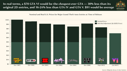 Epyllionの分析によると,1997年に発売された初代「Grand Theft Auto」を,2025年の物価水準(インフレ調整)で見積もると約100ドル相当になる。これを基準にシリーズ全作品を比較すると,実質的な価格(リアルプライス)はむしろ下がり続けているそうだ