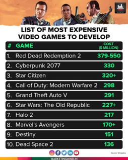 これはインドのPR会社Marketing Mindが作成した「過去のゲーム作品を開発コスト順にまとめたトップ10リスト」だ。昨今のゲーム開発費が高騰している背景には,大人数の開発者を長期間にわたって雇用するからなのは明らかだが,こうした構造的なコスト増をどう抑制するかが見えない以上,メーカー側がゲームの販売価格を上げようとするのも無理はない……