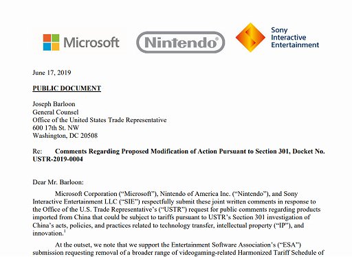 前項で記したように,2019年の関税強化が検討された際にゲーム関連の輸入品目が対象外とされたのは,マイクロソフト,Nintendo of America,そしてソニー・インタラクティブエンタテインメントのプラットフォームホルダーが,3社合同となる書簡を送ったからだ(外部リンク)。