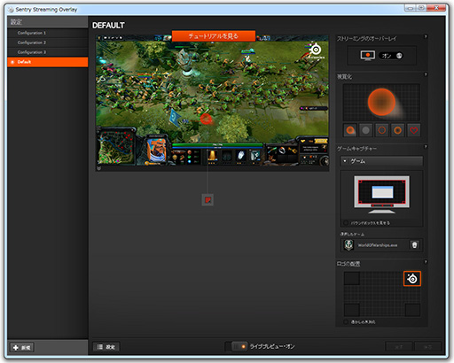 というわけでここからは,Sentryのセットアップが済み,OBSも導入し終えた前提で,スクリーンショットとそのキャプションを軸に,基本的な使い方を説明していきたいが,それに先だって1つ,お断りしておくことがある。,Sentry Streaming Overlayメインメニューの[チュートリアルを見る]ボタンを押すと,SteelSeriesのWebサイトにある「Streaming Overlayチュートリアル」ビデオが再生されるはずなのだが,筆者の環境だと,それに従っても正常に動作しなかったことだ。今回は,筆者の環境で動作した手順の紹介となるので,可能であれば,SteelSeries公式ビデオもチェックすることを勧めたい。