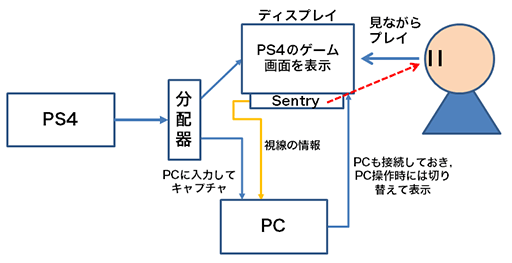 PS4のゲーム映像は,分配器によって分配し,Sentryを取り付けたディスプレイと,キャプチャ用PCに入力する。そして実際のプレイは,ディスプレイに入力されたPS4の映像を見ながら行う。このとき,PC側のキャプチャソフト上から確認できる映像は,どうしても多少の表示遅延があるはずなので,それを見ながらプレイするというのは現実的ではないだろう。