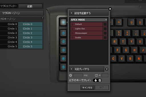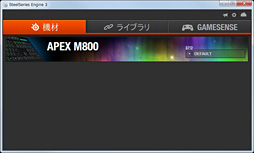 さて,Engine 3の「機材」タブにおいて「Apex M800」をクリックすると,下に示したとおり,Apex M800に最適化された状態でEngine 3のメインウインドウが開く。左ペインにある「設定」はほかのキーボード用設定ツールでいうところの「プロファイル」にあたるもので,初期状態では「Default」「Lights Out」「Minesweeper」「Snake」という4種類のプロファイルが用意されているのだが,実のところ,Default以外の3つはLEDを使ったミニゲームだったりする。