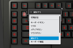 カスタマイズ方法は,キーへの機能割り当てとほぼ同じ。変更したいキーを選んで左クリックし,メニューから選択するだけだ。LEDイルミネーション変更用のメニューはポップアップせず,右ペインの左端に常時表示されているので,ここから選ぶことになる。