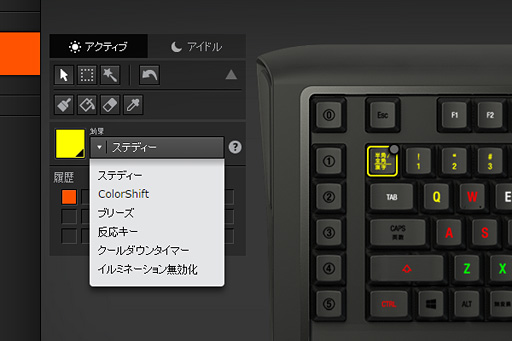 キーボードの操作中(「アクティブ」)と,放置してしばらく経った状態(「アイドル」)で,異なるライティングを設定することにも対応している。