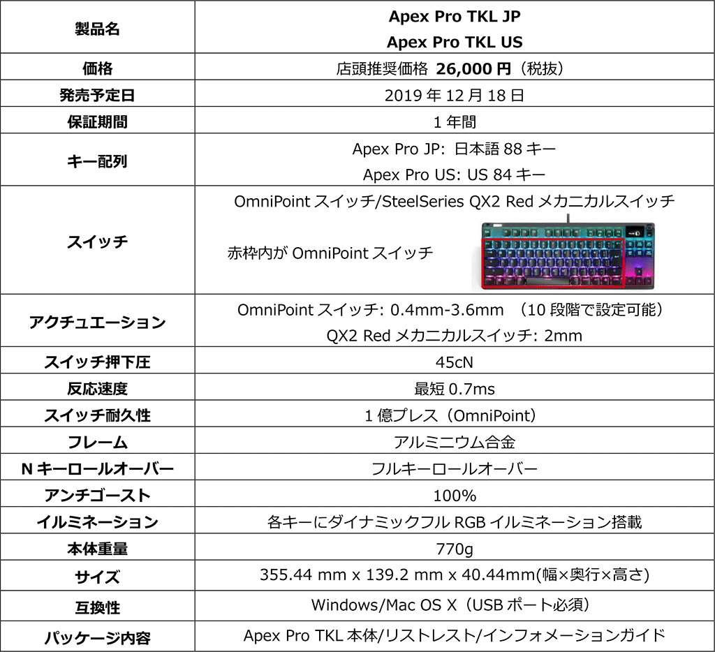 SteelSeries,ゲーマー向けキーボード「Apex Pro TKL」を12月18日発売。キーごとにアクチュエーションポイントを変えられる10キーレスモデル