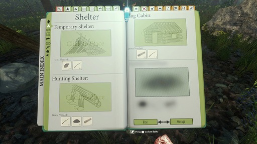 本作にはクラフト要素も用意されており,インベントリからガイドブックを見ることで,作成できるアイテムの一覧が確認できる。ここで作成したいアイテムを選択すると,白い仮組みが表示されるので,それを好きな場所に設置したら,必要な素材を組み込んでいこう。