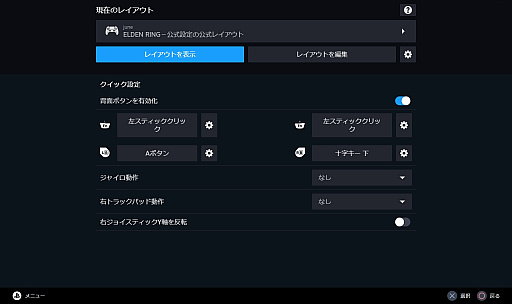 DualSenseのところで説明したように,ハプティックフィードバックやアダプティブトリガーを体験するためには,タイトルのプロパティ画面から入れるコントローラ設定画面で「Steam入力を無効にする」を選択(=キーレイアウトの設定が不可になる)する必要があった。つまりトレードオフになってしまって,機能をフルには使えなくなってしまうのだが,今回はあえて「Steam入力を有効にする」をオンにし,「ELDEN RING」用にキーレイアウトを編集してみた。