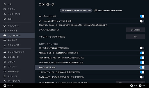 接続後,Steamのコントローラ設定で「Switch ProコントローラーのSteam入力を有効にする」をオンに。その下に出てくる「Joy-Conペアを連結」をオンにすれば,「L」「R」の組み合わせが1台のコントローラとして認識される仕組みだ。