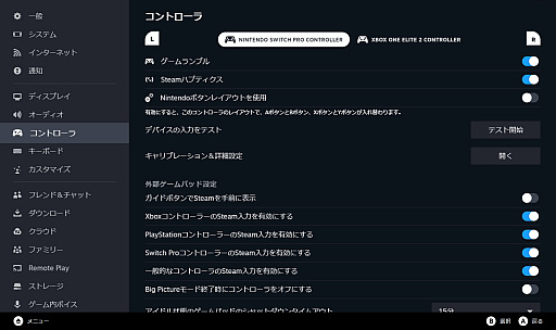 Steamでのコントローラ設定は,大まかに分けると,主に接続などに関する「Steam全体での設定」と,ボタン割り当てなどに関係する「ゲームタイトルごとの設定」になっているので,注意してほしい。
