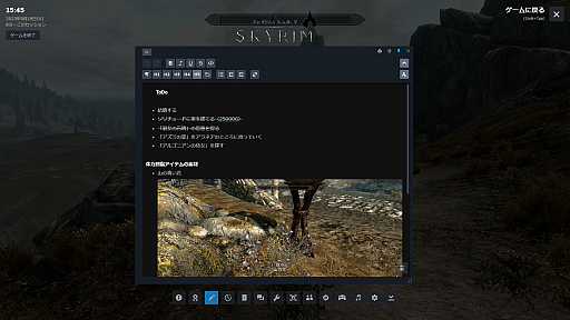 画像を挿入することもできるのだが,筆者が調べた限りでは,[Print Screen]で撮影した画像を[Ctrl]+[V]で貼り付ける形になるようだ。Steamでは,[F12]で撮影したスクリーンショットがゲームごとに保存されるようになっており,Steamオーバーレイでもその管理ができるが(詳細は後述),そこからドラッグ&ドロップでメモに挿入することはできなかった。