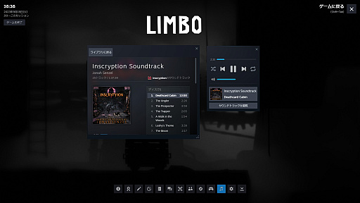 文字通りの音楽プレイヤー。再生できるのはSteamで購入したサウンドトラックのみだが,プレイしているゲーム以外のサントラも聴ける。