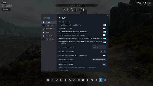 Steamの設定にある「ゲーム中」の項目(主にSteamオーバーレイに関係する)が開く。Steamオーバーレイの画面下に表示されるツールバーの項目や,Webブラウザーのホームページはここで設定できるので,自分に合わせてカスタマイズしておくといい。