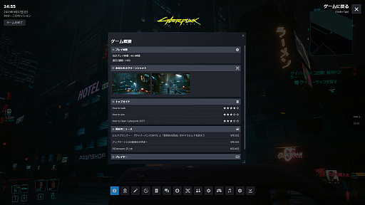「概要」と言っても,ゲーム内容が説明されているわけではなく,最近更新があったコンテンツが軽く通知されるといった感じのウインドウ。これまでのプレイ時間(通算と直近2週間)のほか,ガイドやスクリーンショットへのリンク,最近マルチプレイを一緒に楽しんだプレイヤーなどが表示される。