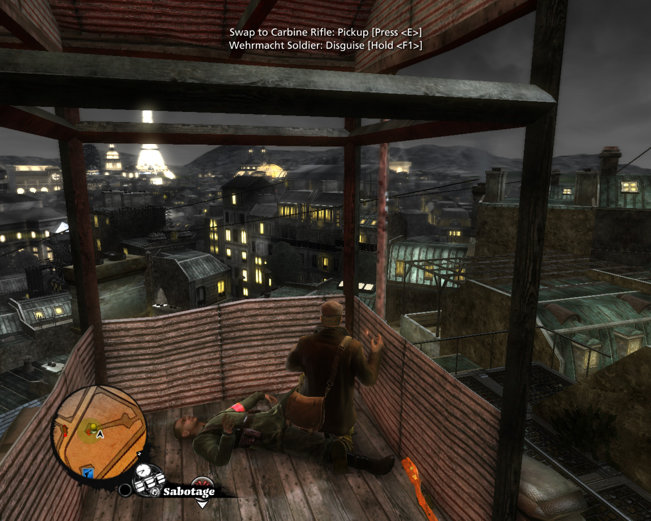 SeanはSplinter Cellのサム・フィッシャーのように,あるいはAssassin's Creedのアルタイルのように身軽で,窓枠に飛びつきながらアパルトマンの壁を登り,雨どいを伝って移動し,電線を使ってラベリングし,高いビルもひとっ飛び。さらに,倒したドイツ兵の服を奪って変装できたりもするので,それらを使って目的地にこっそり潜入し,爆弾を仕掛けたり,ロケット弾を撃ったりすることになるのだ。