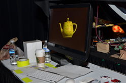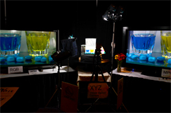 前年の反省を生かしてなのか,2011年のE-TECH展示セクションでは,池上通信機と,静岡大学創造科学技術大学院ナノビジョンサイエンス部門の下平美文教授とに協力を仰ぎ,その場に実在する物体を実際にキャプチャ(撮影)して,5原色液晶パネルでリアルタイムに表示するという展示を行っていた。