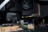 採用されているハーフミラーは円形で,直径約910mm(≒36インチ)。このハーフミラーの外周3点にはボイスコイル,いわゆる振動板なしのスピーカーユニットが備え付けられており,ホストコントローラ――PCではなくカスタムコントローラユニット――制御で振動させている。ちなみに振動数は30Hz以上だという。