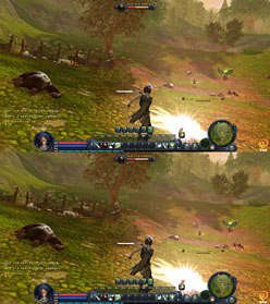 さて,AIONの立体視で何ができるかだが,前述のとおり,ぼけーっと歩き回るのに向いている。というか,普通にプレイできるとはあまり思わないほうがいい。ライトシールドを外せばキーボードを見ることもできなくはないのだが,相当に下を見なければならなくなるのであまりお勧めできない。マウスと[W]キーだけ使うと割り切れば,いつもと違った体験が楽しめるだろう。