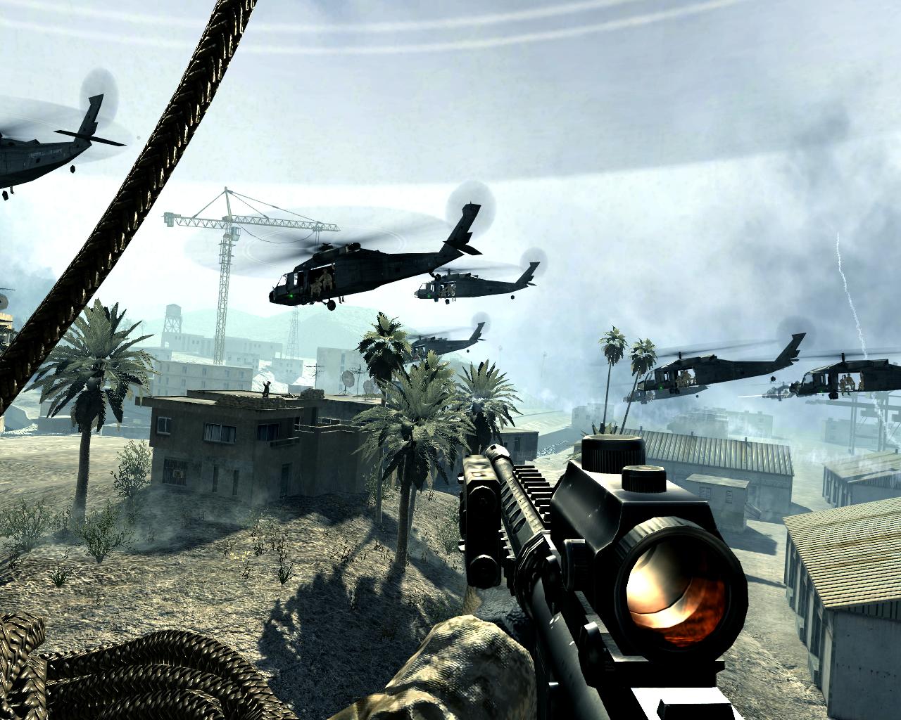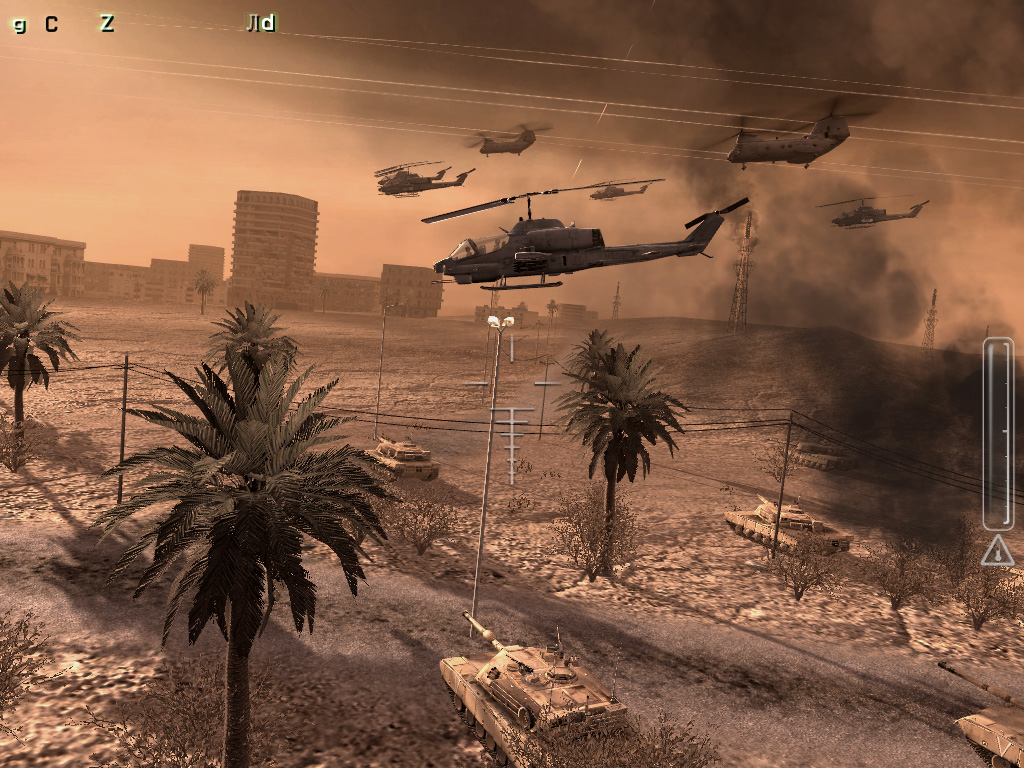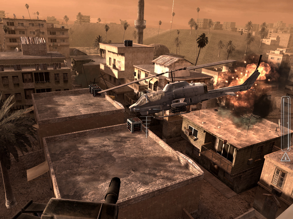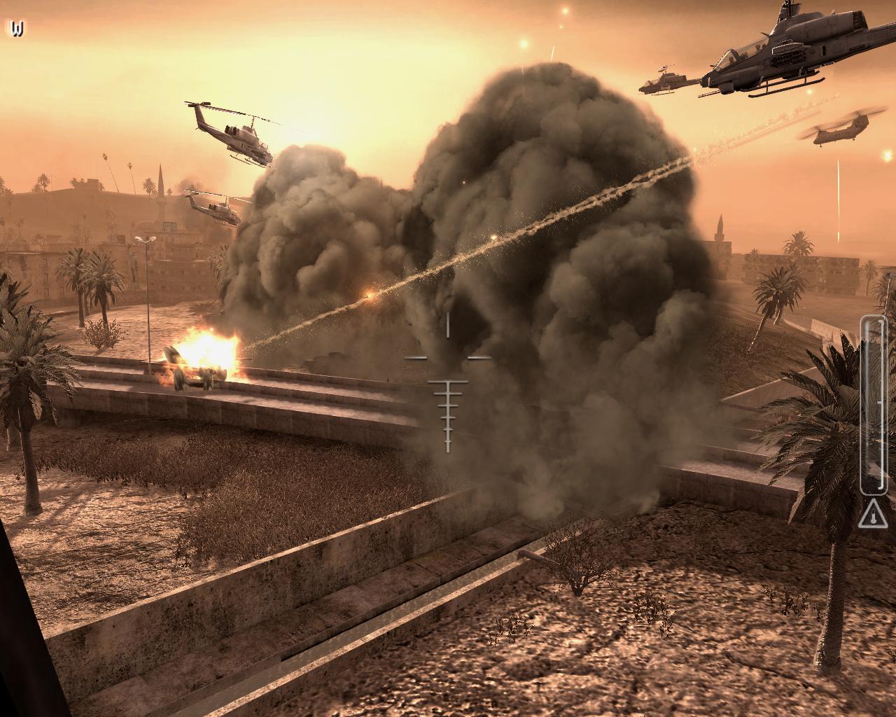 ミッションは輸送ヘリに乗った状態で始まる。多数の攻撃ヘリと,地上には戦車隊。作戦終了に向けての総攻撃であることがうかがえる。プレイヤーはこの時点でヘリの機関砲の砲手を務めている。地上にいる敵の装甲車,RPGを持った兵士,対空砲などを攻撃しよう。
