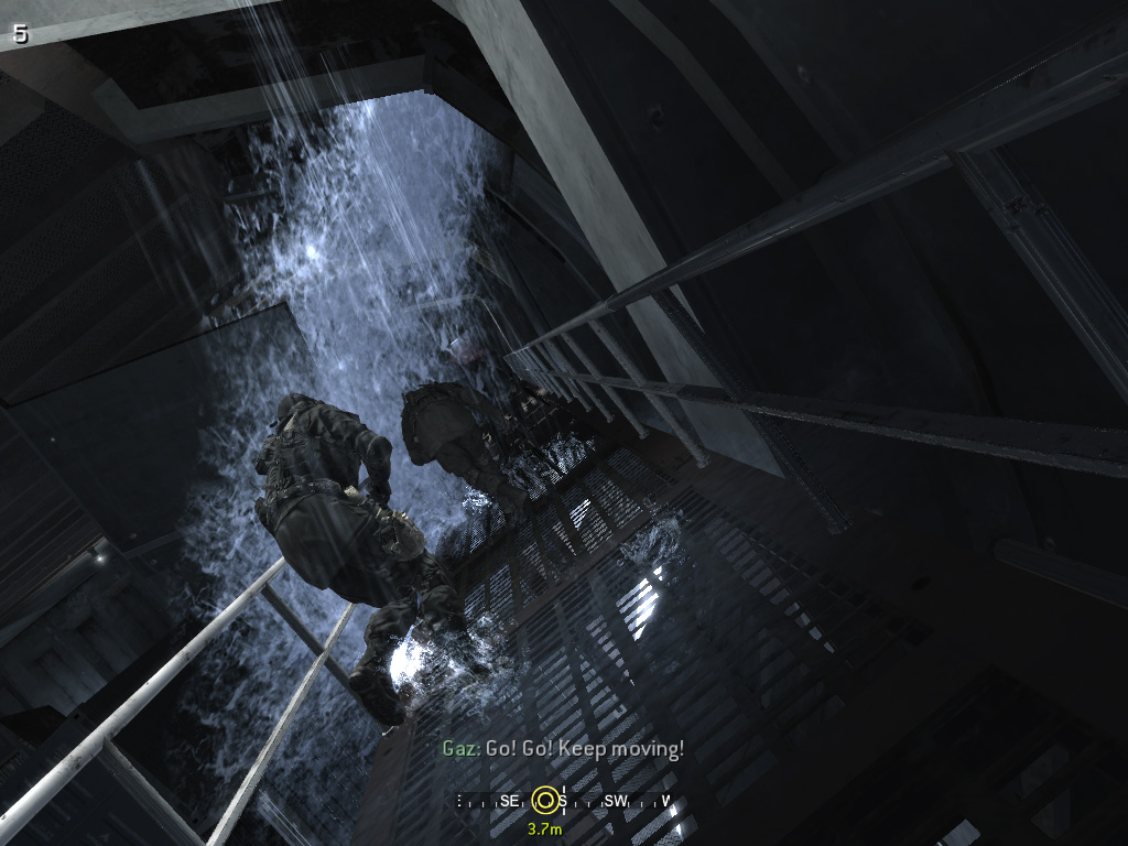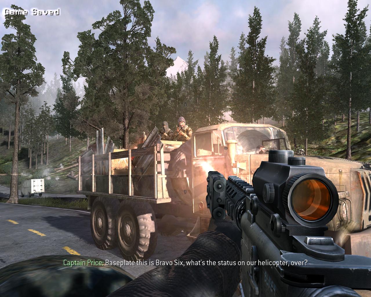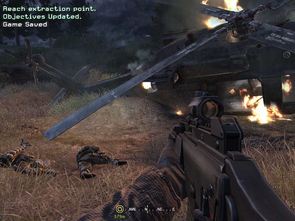 ロシア西部。Nikolaiを救出し,ヘリで脱出したSASだが,敵の対空ミサイルにより撃墜されてしまう。気絶しているところをPrice大尉に起こされるが,この時点ではピストルしか持っていない。墜落したヘリの周囲に武器が落ちているので拾ってから進もう。SAS隊員を見つけ出そうと,敵はすでに厳戒態勢で墜落現場に向かっている。