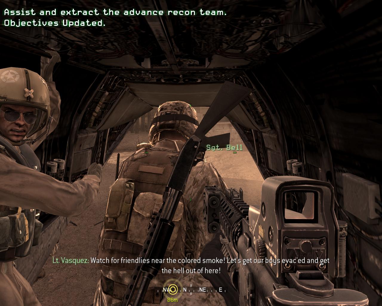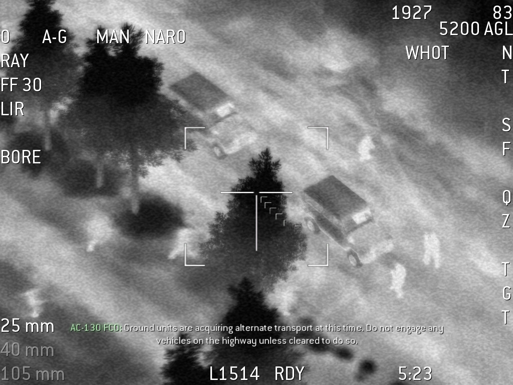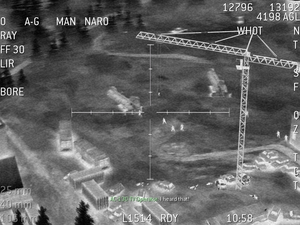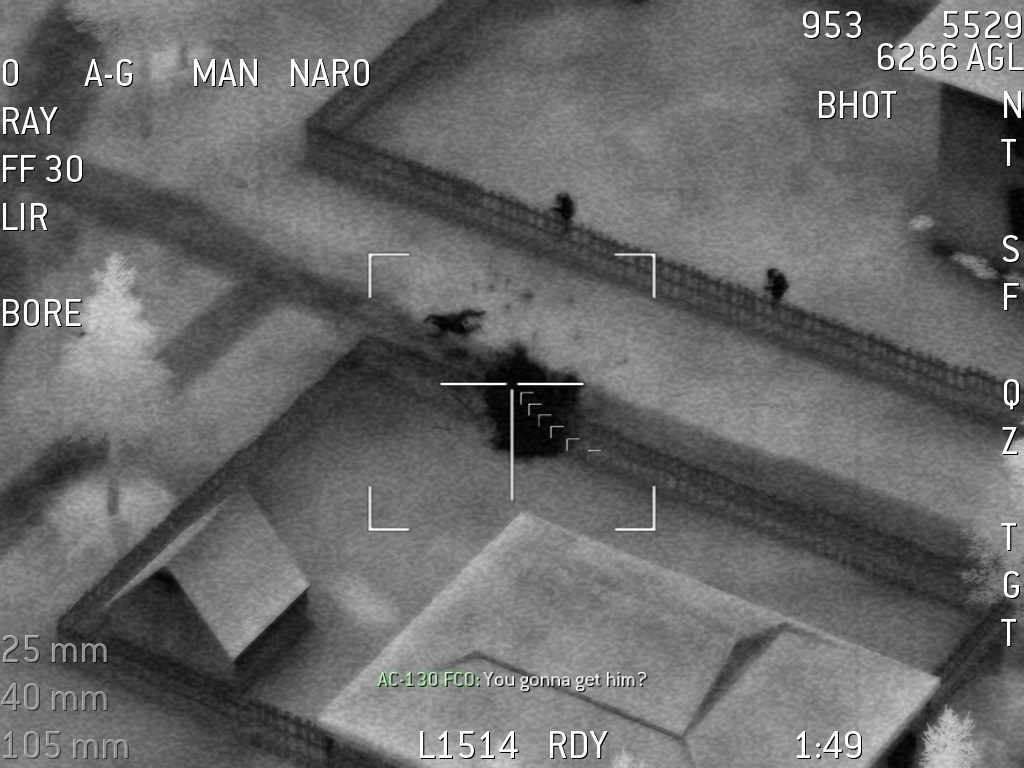 先のミッション「Hunted」の終盤でSAS隊員を上空から援護した,対地攻撃機AC-130スペクターの射手となる。このAC-130は,毎分1800発もの発射速度を誇る25mmバルカン砲,40mm機関砲,戦車なみの口径の105mm榴弾砲を備えており,制空権のある空域では驚異的な地上攻撃力を誇る。地上を赤外線モニターで見ながらの攻撃となるが,1キーと2キーによってカメラの倍率を切り替えることにより,自動的に攻撃方法が選択される。