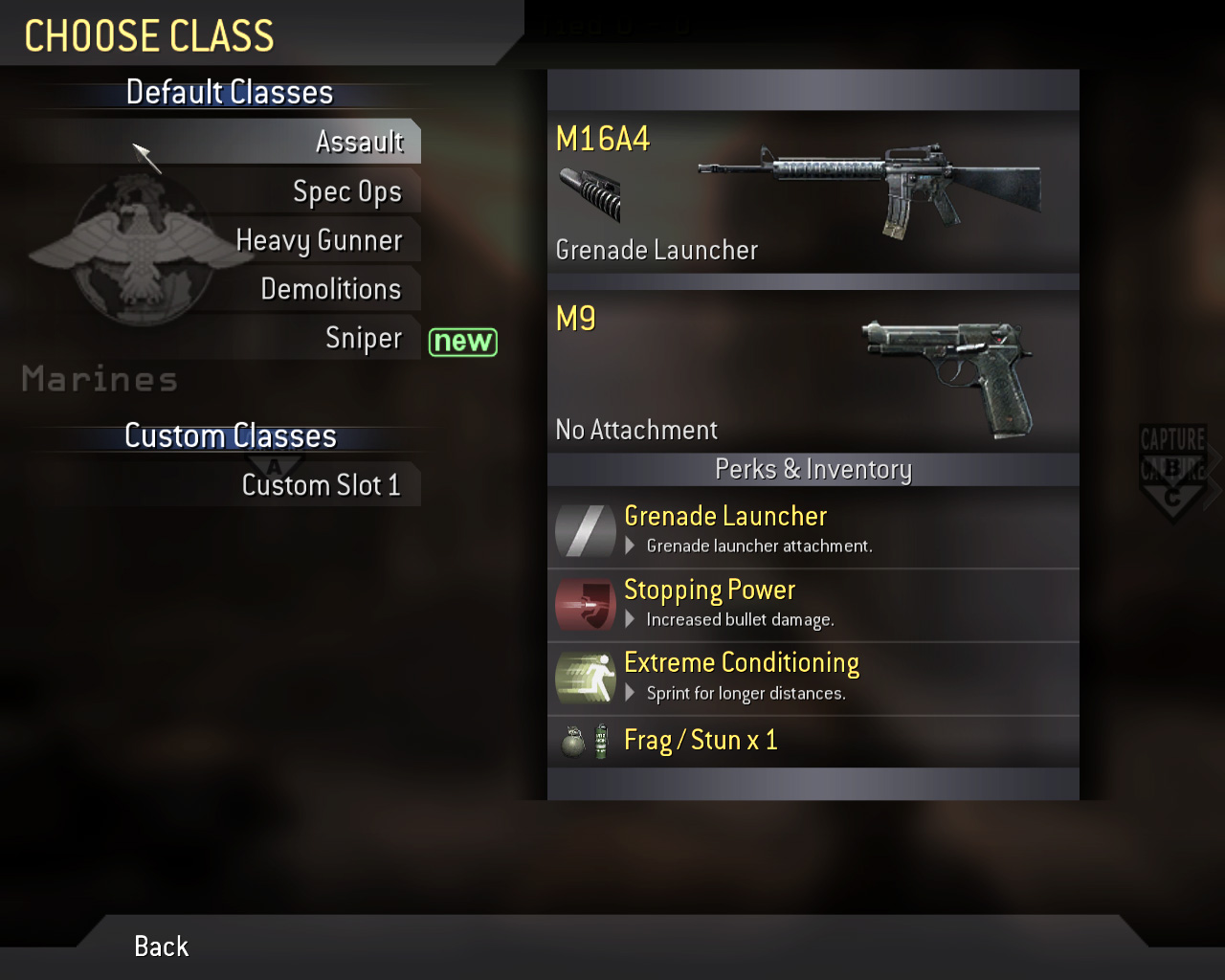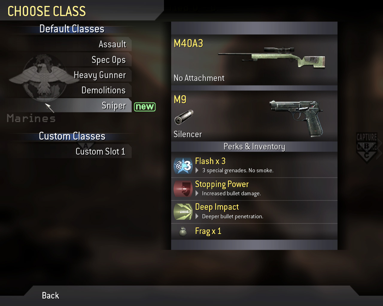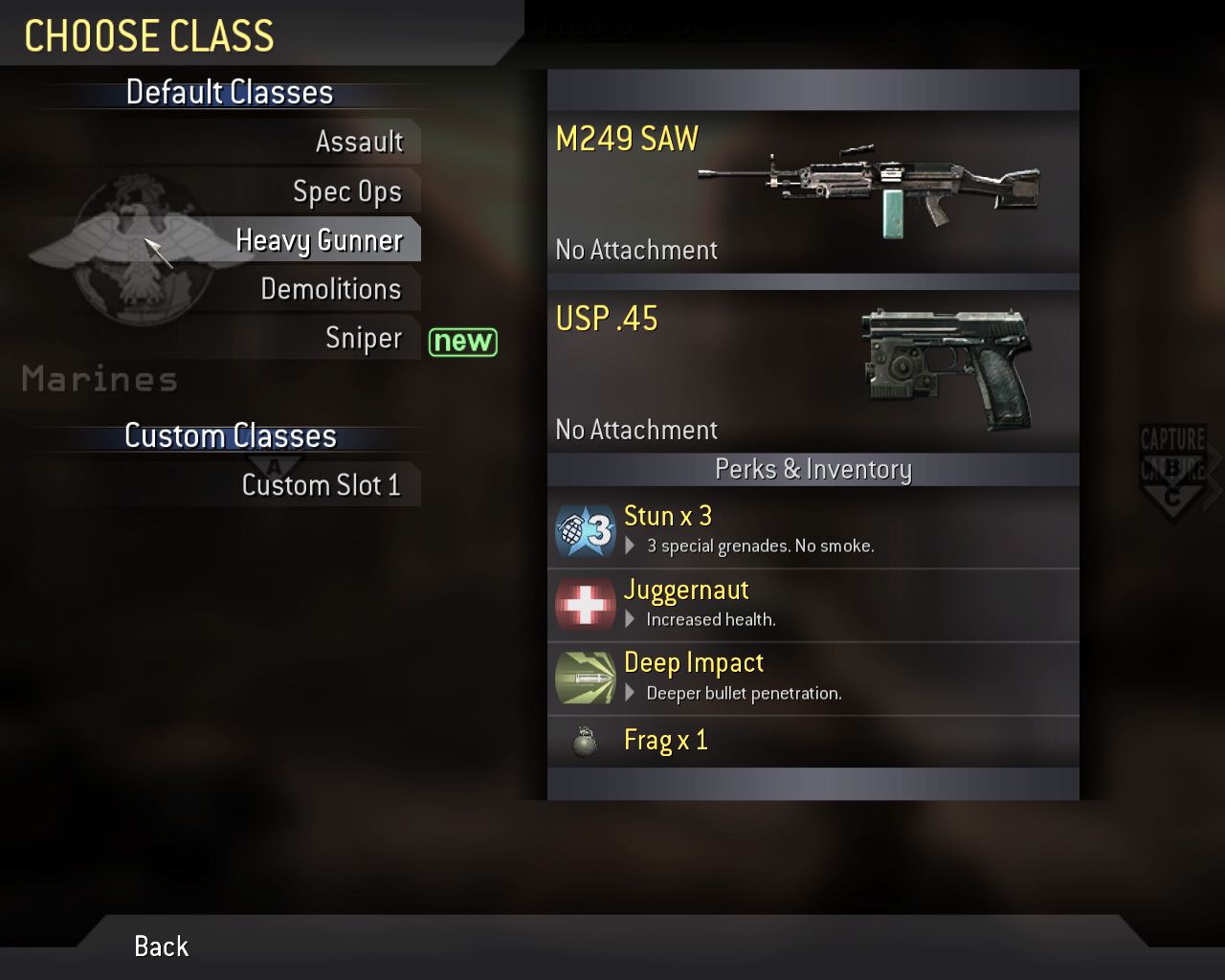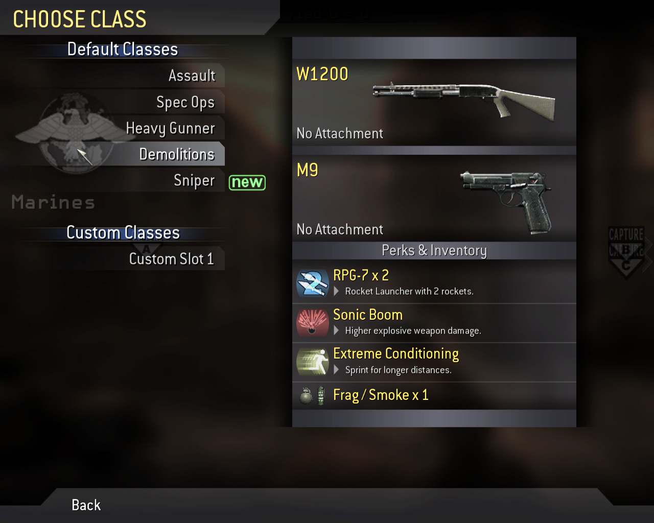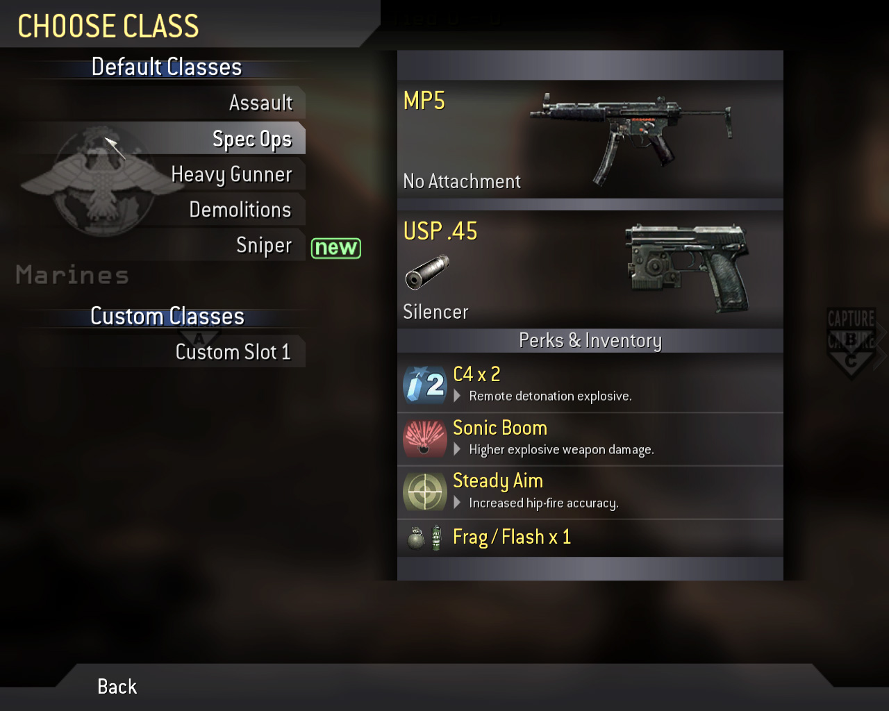 CoD4のキャラクターの違いは,基本的に所持している武器と技能だけである。しかし,武器とそれに見合った技能を組み合わせたクラス(兵科)もあらかじめ用意されている。ランク4に達するとCustom Classで好みの武器やPerkを選択して,独自のクラスを作り出せる。ちなみに,Demolitionsはランク2,Sniperはランク3から使用できるようになる。