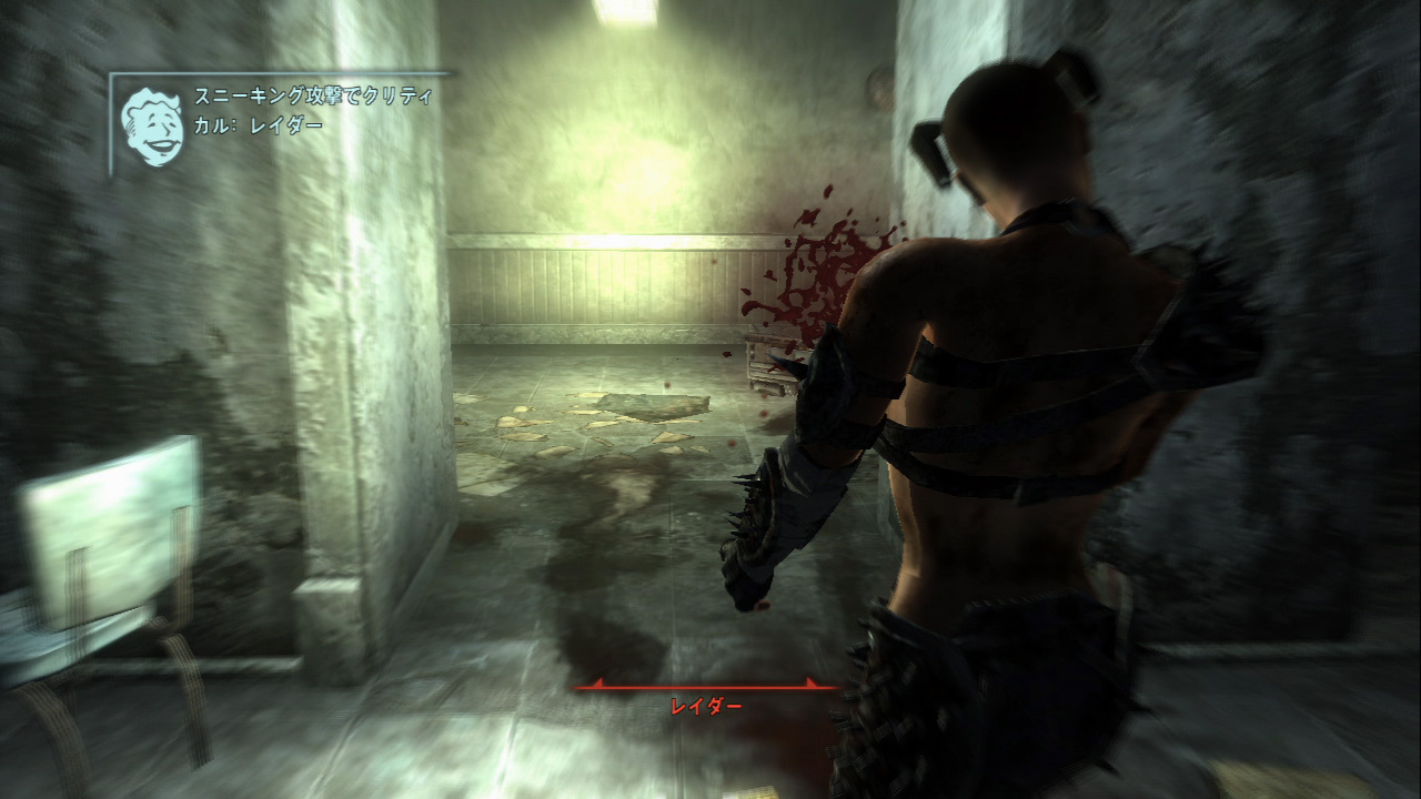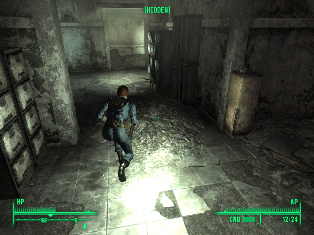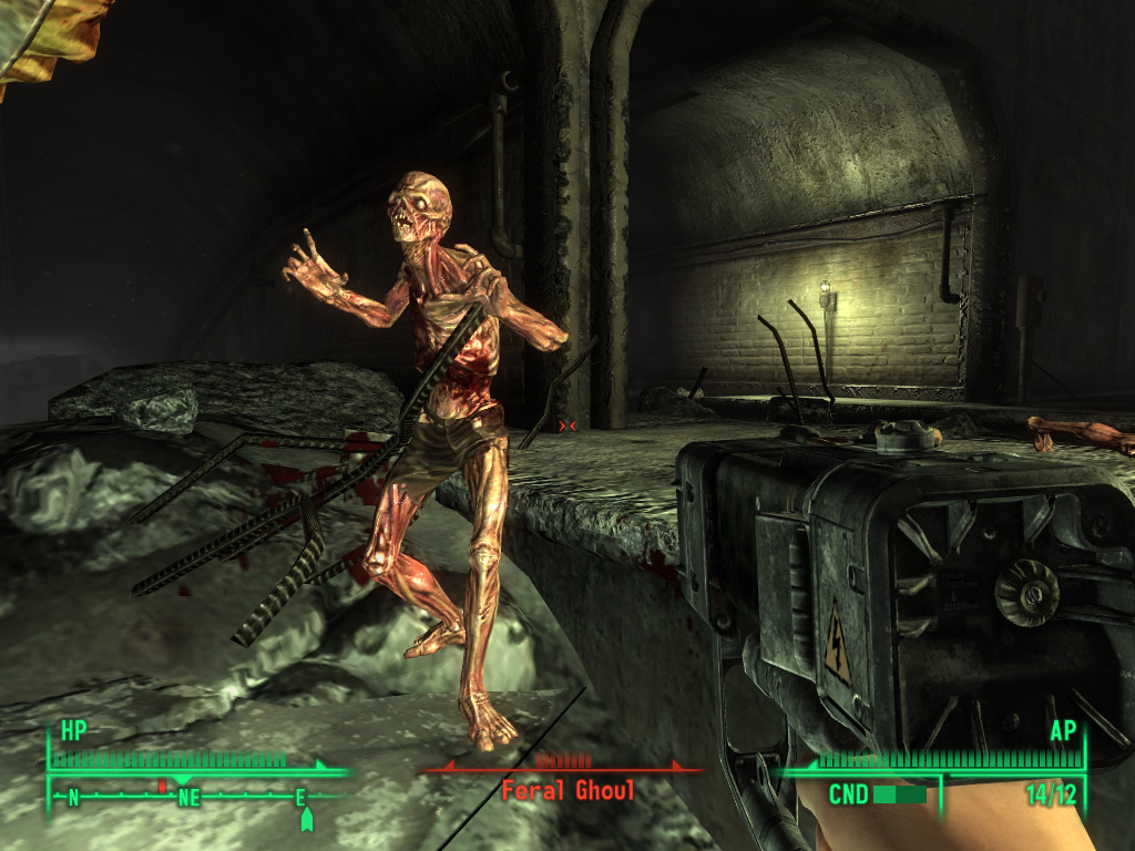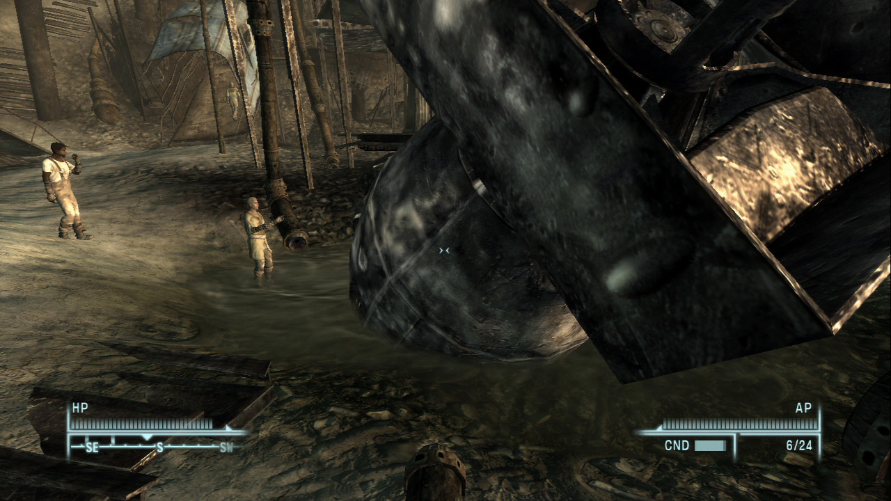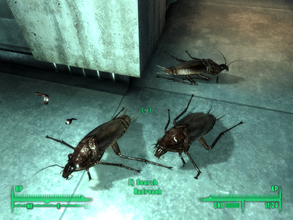 こうなったら「V.A.T.S.を使わずにリアルタイムで攻撃を続ける」か「V.A.T.S.が再び使えるようになるまで(APは実時間15秒程度で再び満タンまで自然回復する)逃げ回る」かの選択をすることになるが,V.A.T.S.から得られるアドバンテージはかなり大きいので,多くの場合逃げるほうを選択することになる。