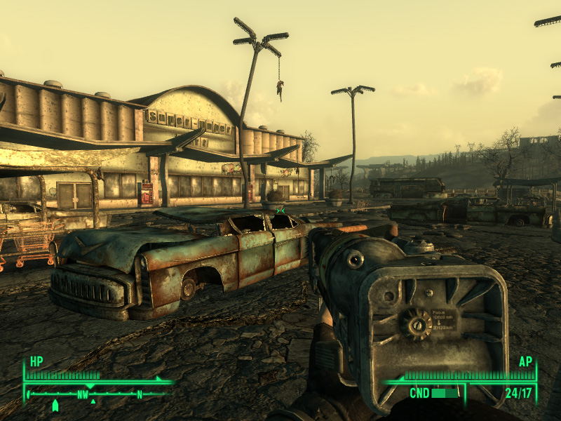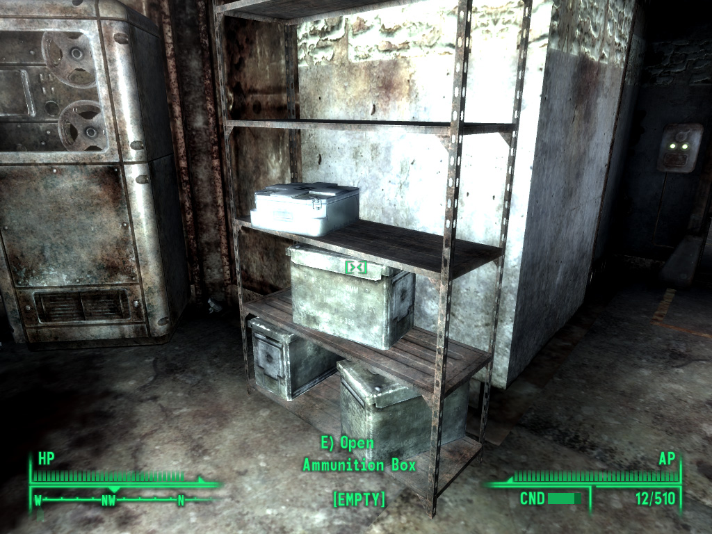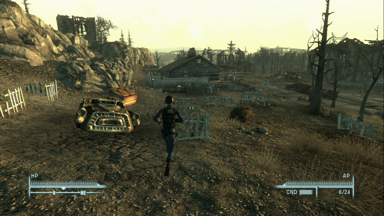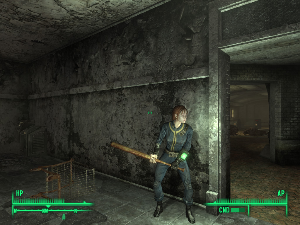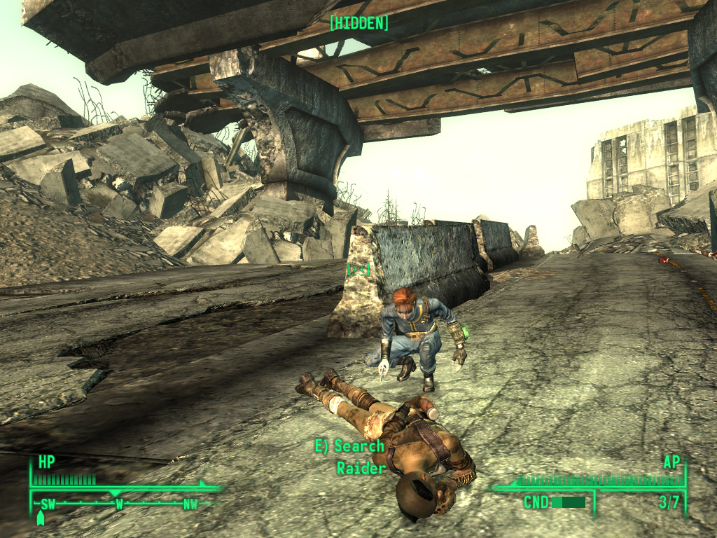 こうなったら「V.A.T.S.を使わずにリアルタイムで攻撃を続ける」か「V.A.T.S.が再び使えるようになるまで(APは実時間15秒程度で再び満タンまで自然回復する)逃げ回る」かの選択をすることになるが,V.A.T.S.から得られるアドバンテージはかなり大きいので,多くの場合逃げるほうを選択することになる。