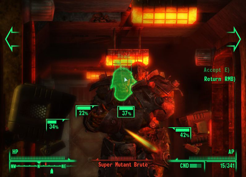 V.A.T.S.はなにも満タンまで回復させなくても,一回撃つのに必要なだけのAPが溜まれば1発は撃てるが,それまでは逃げ回らなければならないことに変わりはない。