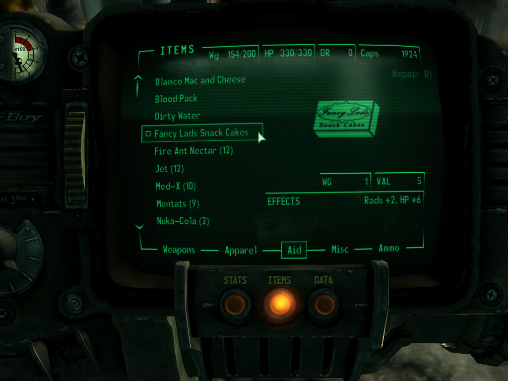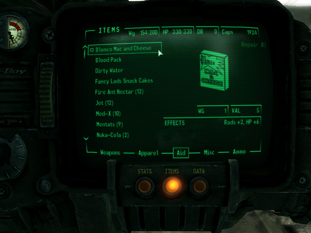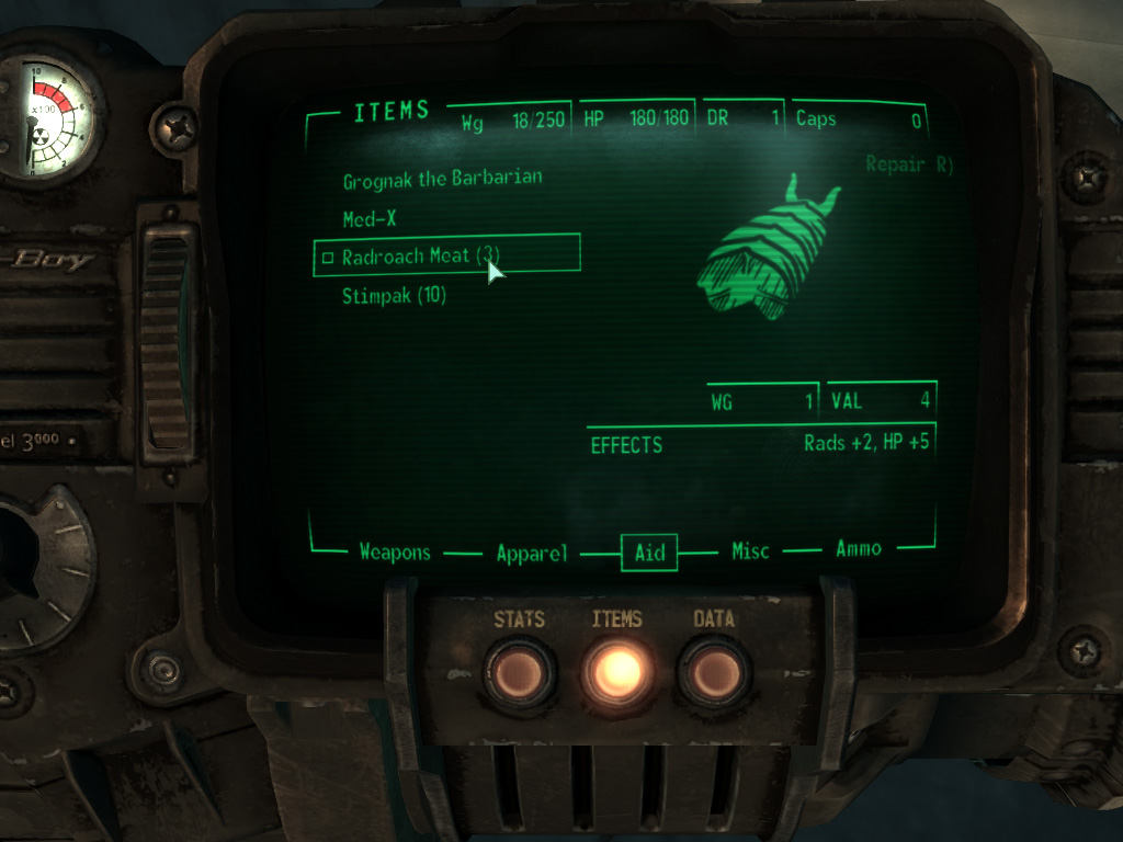 これらのアイテムに体力回復効果があることは知っていた。でもその効果はHP+5とかHP+10とかで,中にはHP+1なんてのもあり,正直なところ,これらはギャグというかゴミに近いものだと思っていた。さらに,こういったアイテムがゴミに見えた一因には,これらが放射能に汚染されていて,摂取するとプレイヤーキャラクターの「RAD」レベルが上昇してしまうことがあった。