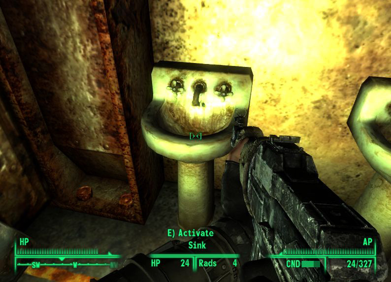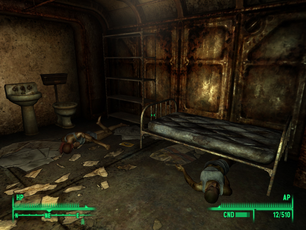 このようにFallout 3では,普通に考えて簡単に手にはいると思われるものがなかなか入手できなかったり,一見ゴミのように見えるものが実は貴重品だったり,一般的には汚い場所とされているところが命をつなぐ水場だったりする。そしてそのような価値観の相違(あるいは,よく“世界観”と呼ばれるもの)は,尺の長い“超美麗! 3Dグラフィックスムービー!”や,プレイヤーが関われない“声優達のおしゃべり”で説明されるのではなく,プレイそれ自体を通じてプレイヤーに伝えられる。だからプレイヤーは,「ここは過酷な世界であり,生き抜くのは大変なことなのだ」ということを,より強い実感として受け取れる。この点は本作のとても優れているポイントだ。