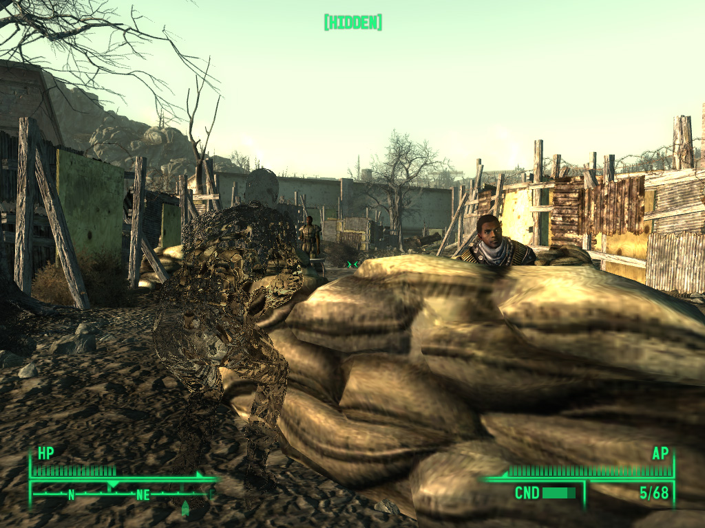 クエストマーカーはその子供を指しているので,どうやら彼と話す必要があるようだ。男に見つからないよう,回り込むように近づいて子供の真横まで来たが――ああダメだ,しゃがんだ状態で話しかけることができない。でも立ち上がればステルス状態が解けてしまう。だけど,ステルスボーイを起動したときあたしは直立していて起動後にしゃがんだから,身体が透明になる効果は立っていてもきっと有効なんだ。