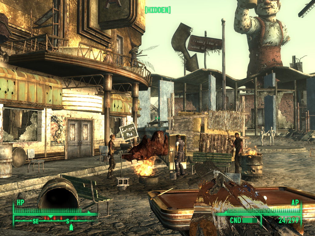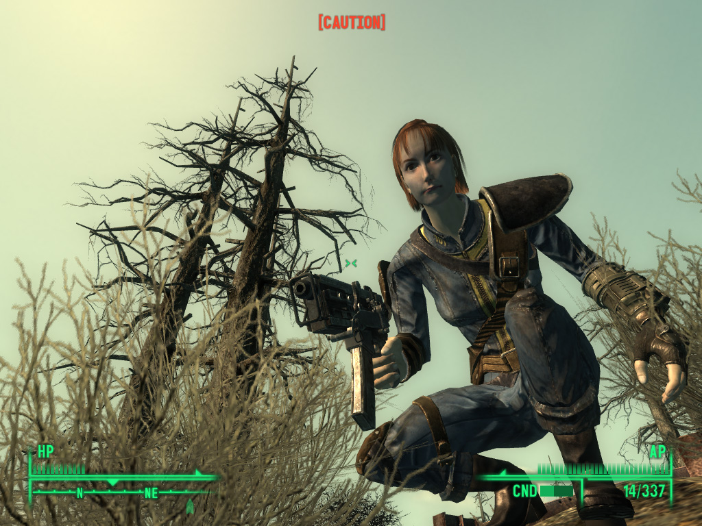 準備を整えたあたしはパラダイスフォールズへ続く道の入り口――門番のGrouse達がいるところまでやってきた。入り口近くの彼らからは死角になっている場所に隠れ,手荷物をあさり,ステルスボーイを取り出して起動させる。ギユーンと音がして自分の姿が透明になった。なるほど,こういうものなのか!