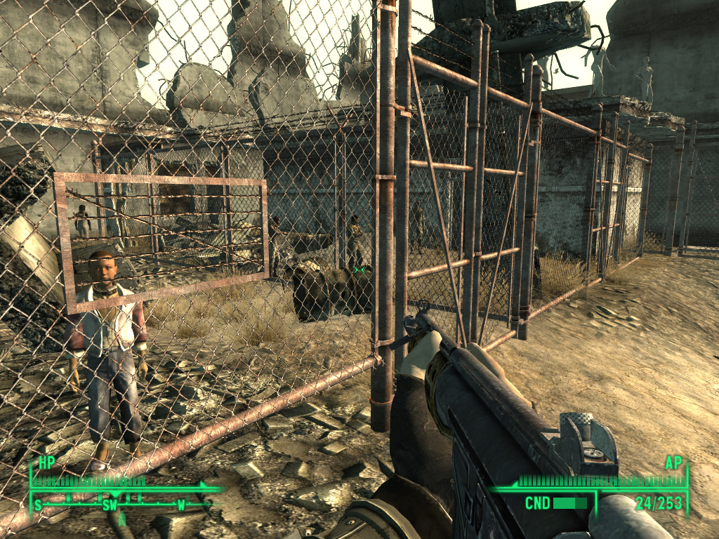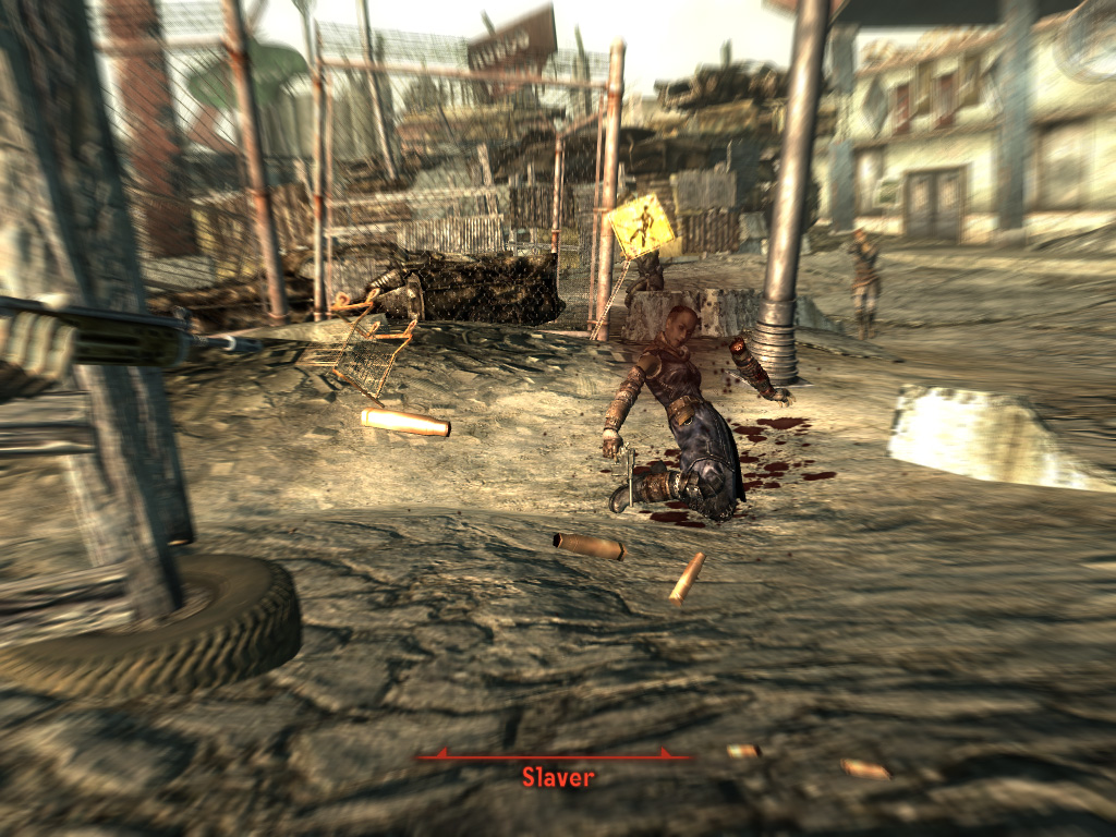 金網のスレイバーは,ハンティングライフルでこちらを狙ってくる。バレル束の回転数が十分に上がったミニガンは,こちらに向かってすさまじい勢いで鉛の弾丸を吐き出す。そして,こちらを射程内にとらえた女商人達はハンドガンを撃ち始めた。