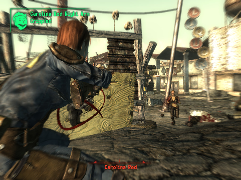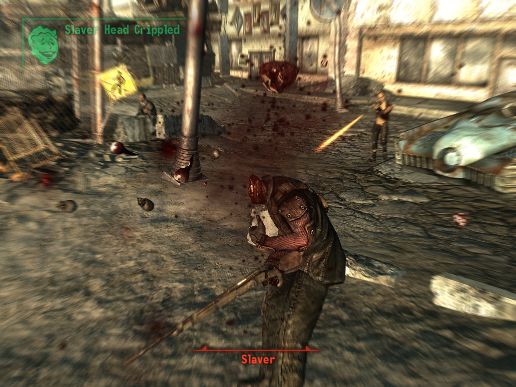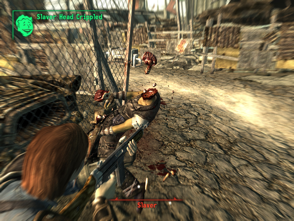 ハンドガンの女スレイバーが撃っている。女の身体と自分の間に障害物がない状態まで身体をズラしてV.A.T.Sを起動。命中率の高かった腕の部分に狙いを定めて射撃を開始する。数度の点射で左腕は女の身体から離れ,クルクル飛び去った。女はその勢いのまま後ろに飛んで倒れた。