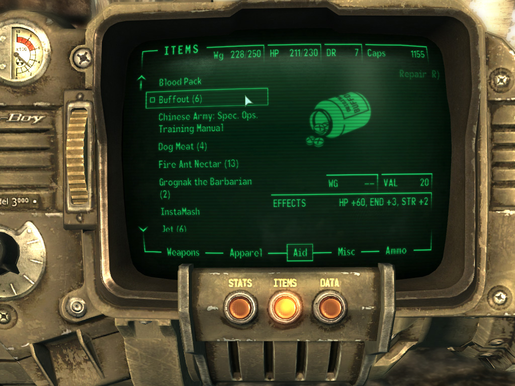 これまではあまり積極的に使ってこなかったドラッグの類だが,今こそ使うときだろう。「Buffout」「Mentats」などとラベルの付いたそれらを水とコーラを使って喉に流し込み,「Psycho」という使い捨ての注射器型の薬もあったので迷わず使った。これはどうやら攻撃力が増す薬らしい。
