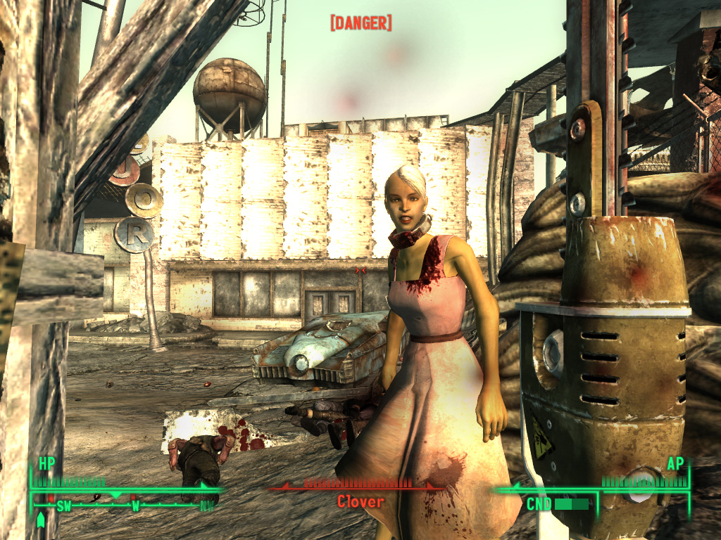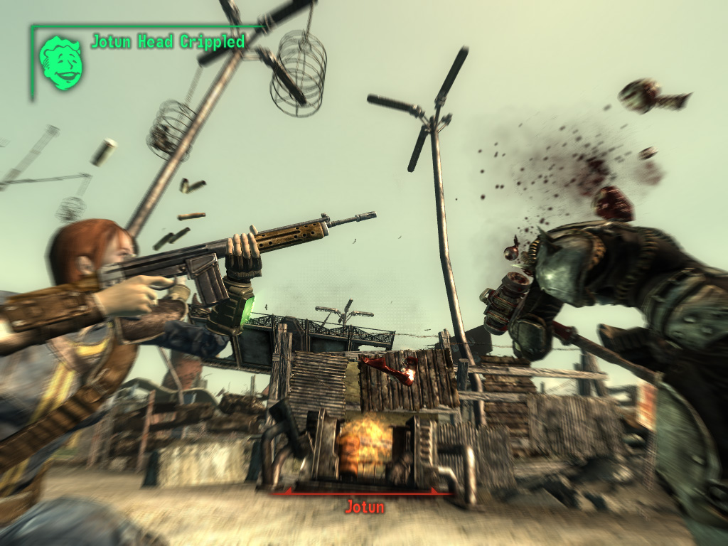 すぐにV.A.T.Sを起動して撃たれる前に倒そうと試みるが,行動ポイントの自然回復が足りなくて殺しきれない。V.A.T.Sの効果が切れたところでミサイルを撃たれた。身体のすぐ横に着弾して爆発し,あたしの半身がつぶれた。