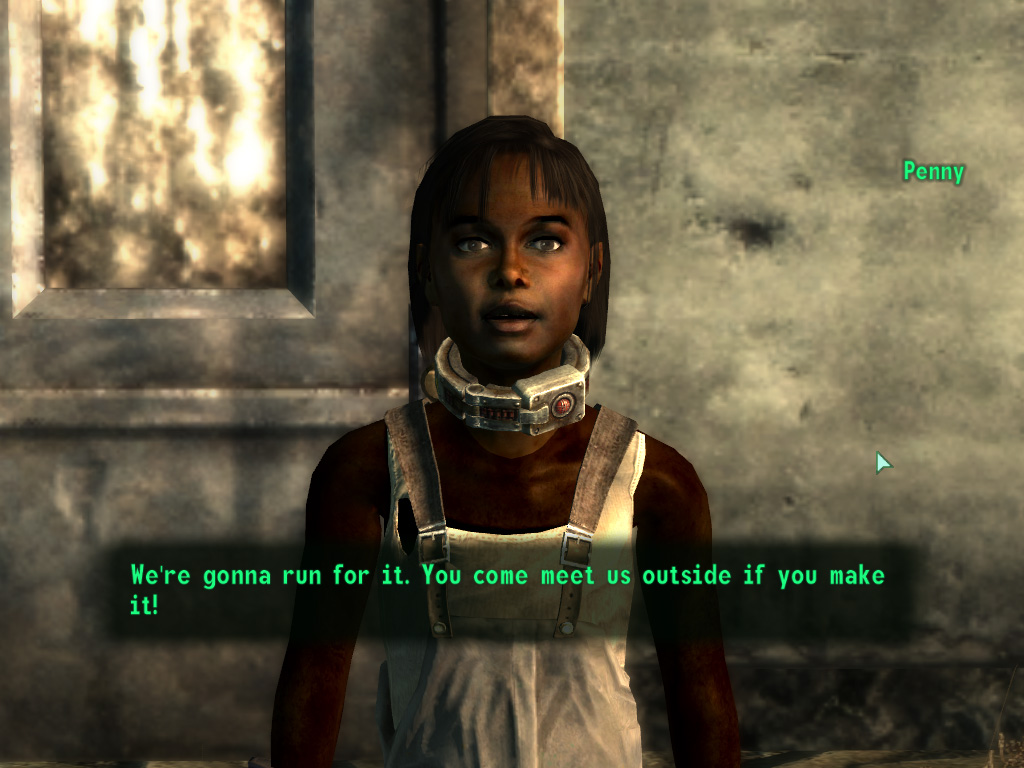 ――メガトンの町を出て荒野をしばらく北に進むと,かつて過ごしたVault 101の入り口近くにさしかかる。あたしは立ち止まって,そちらを見ながら少しの間,考えた。
