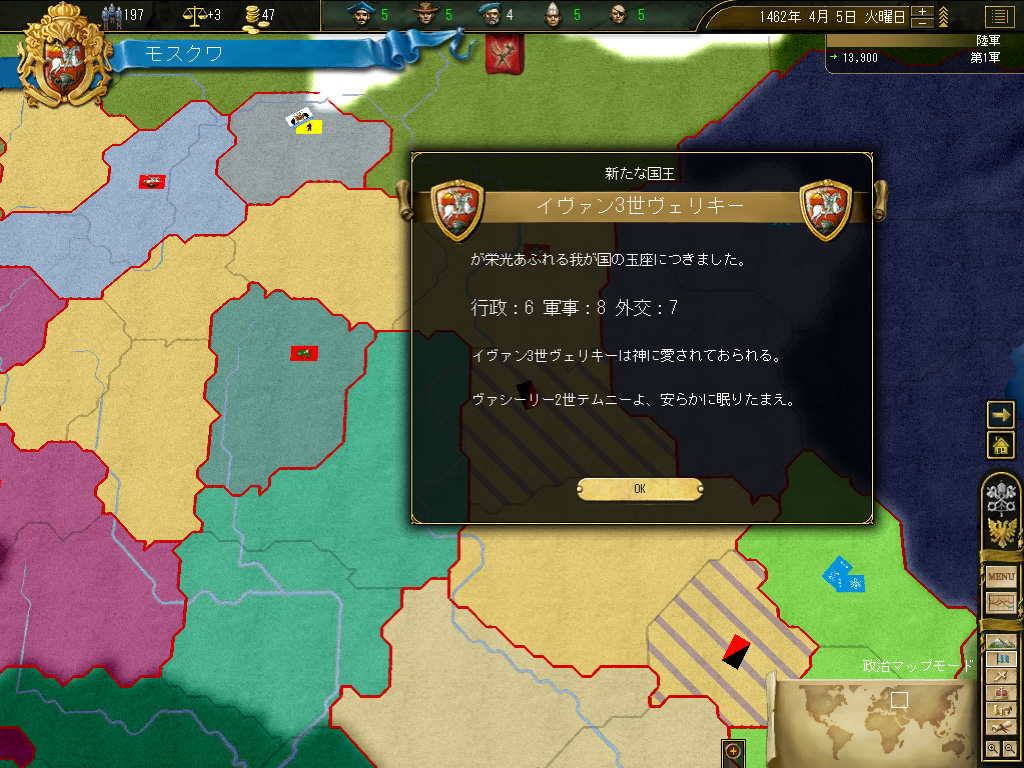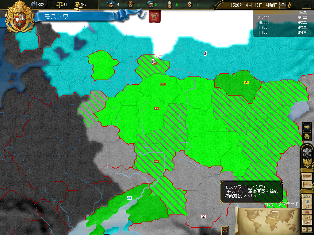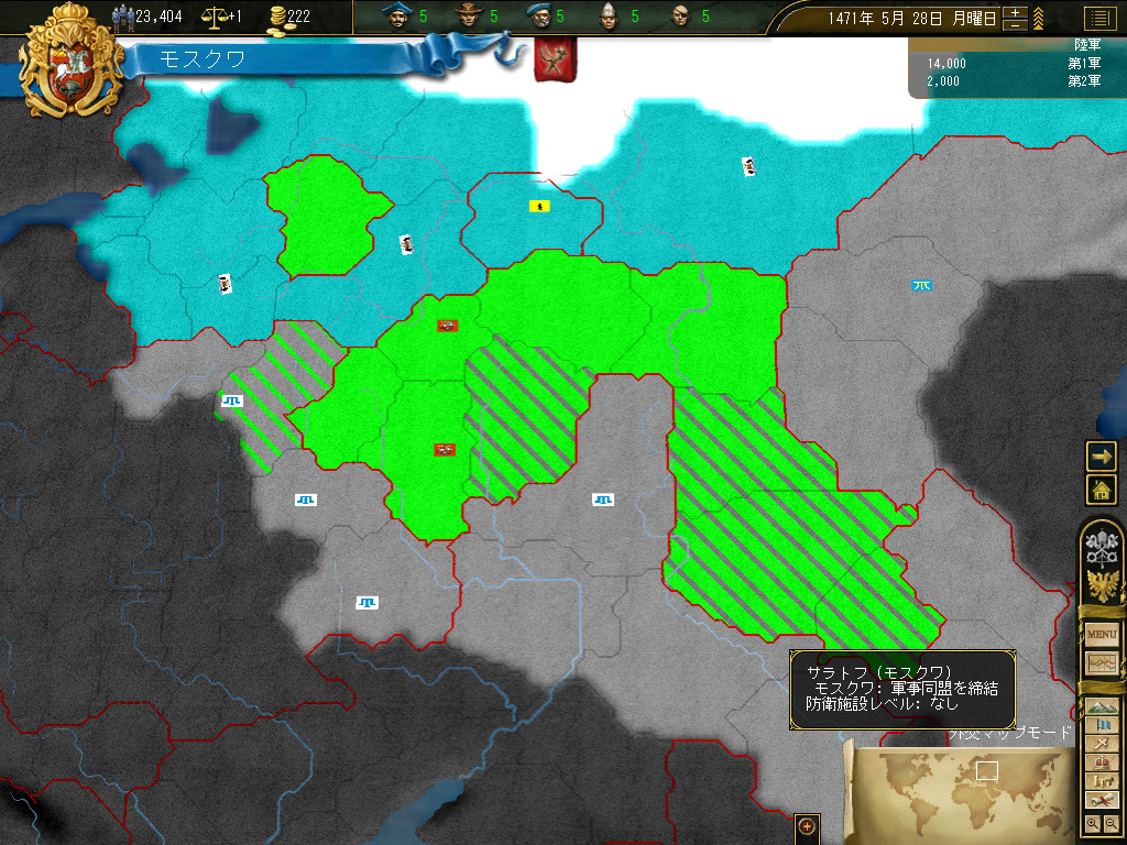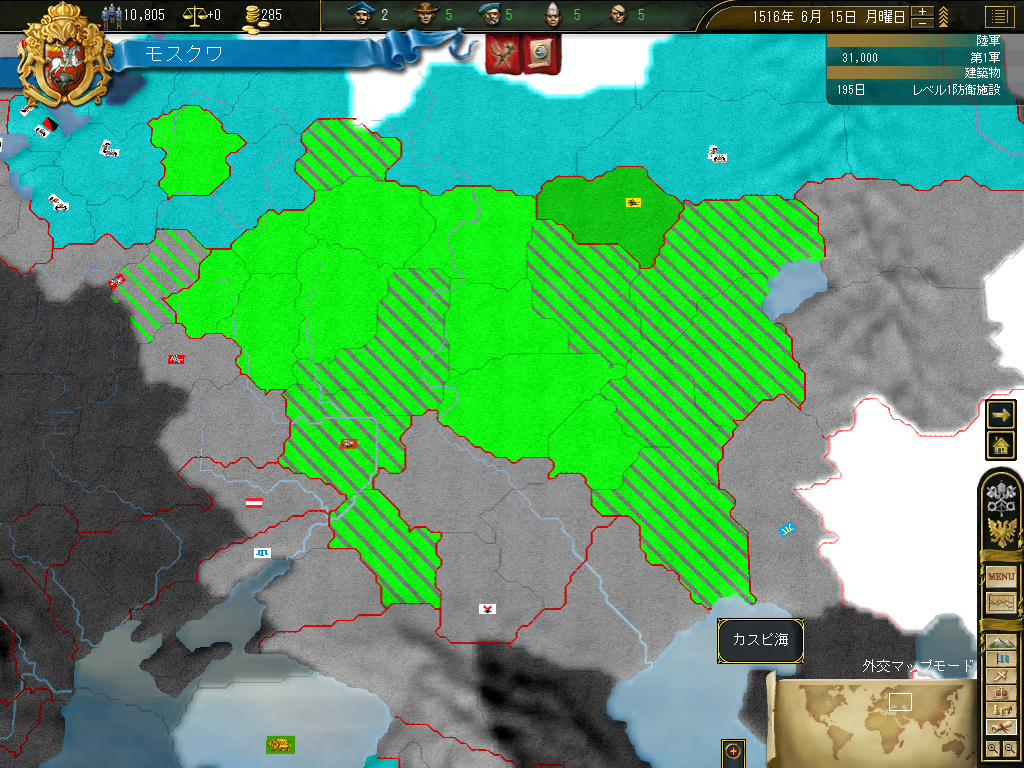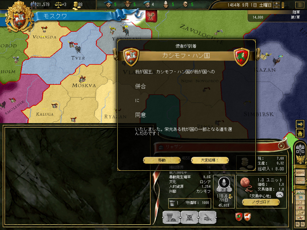新規領土が落ち着いてきたあたりで,今度はこちらからカザンに戦争をふっかける。開戦理由のない「ならず者国家」的な宣戦布告であるため,安定度−2のペナルティを受けるが,それはあとでゆっくり回復させればよい。またしてもカザンの同盟国が参戦してきたものの,例によって袖の下を包んでお帰りいただき,カザンを徹底的に叩く。この戦役でカザンが支配していた金鉱を獲得,モスクワの財政はだいぶ改善された。