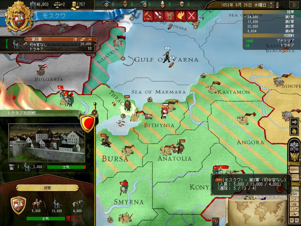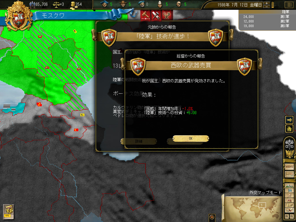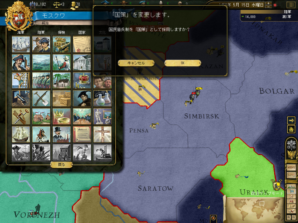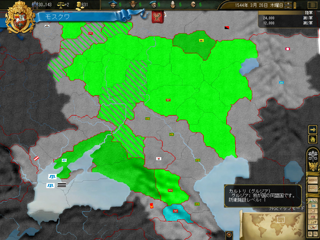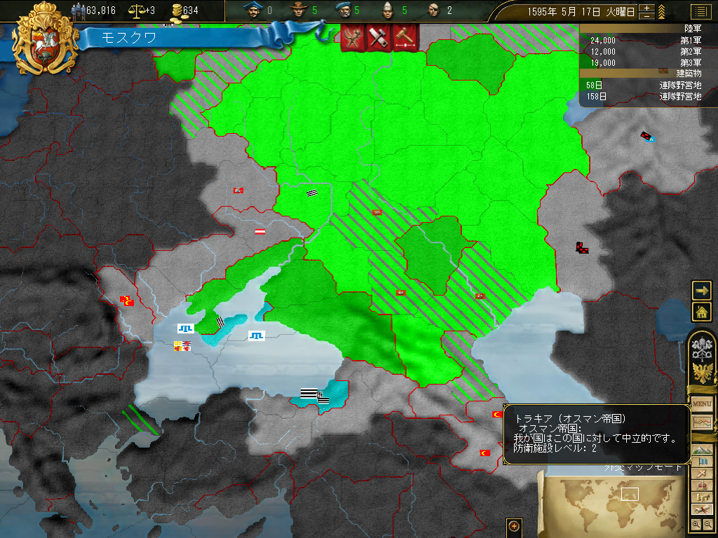 新規領土が落ち着いてきたあたりで,今度はこちらからカザンに戦争をふっかける。開戦理由のない「ならず者国家」的な宣戦布告であるため,安定度−2のペナルティを受けるが,それはあとでゆっくり回復させればよい。またしてもカザンの同盟国が参戦してきたものの,例によって袖の下を包んでお帰りいただき,カザンを徹底的に叩く。この戦役でカザンが支配していた金鉱を獲得,モスクワの財政はだいぶ改善された。