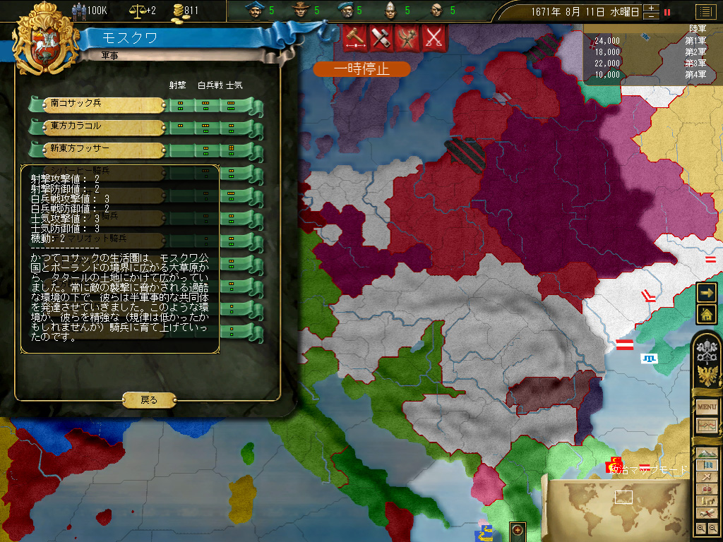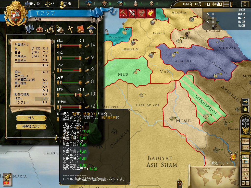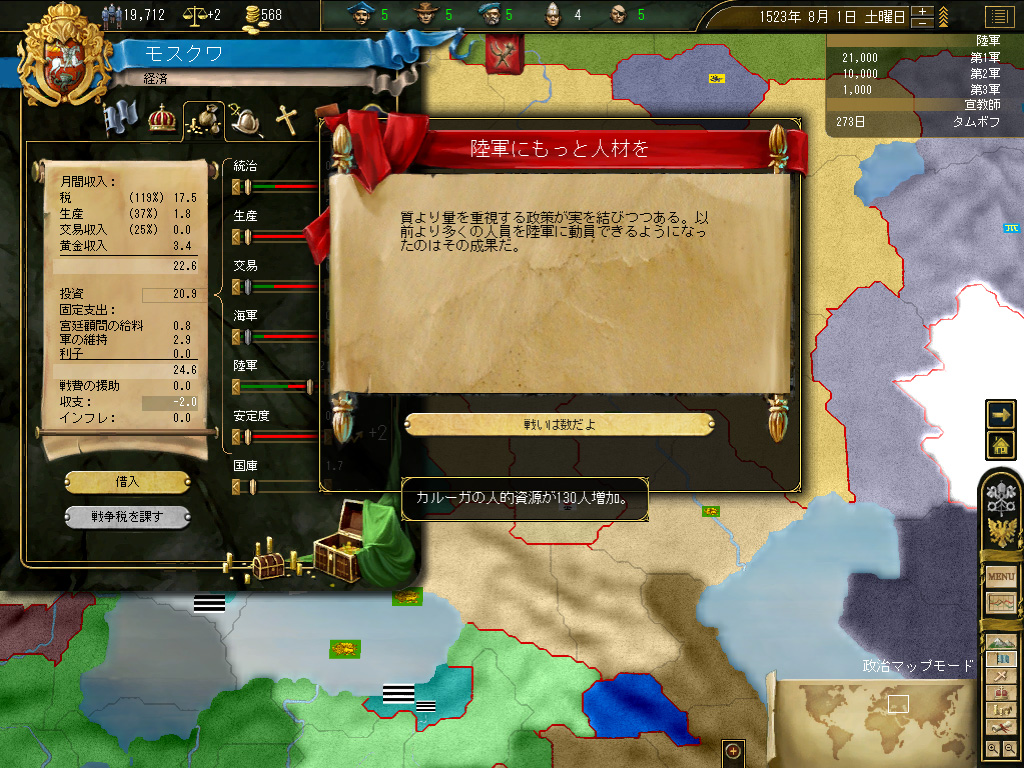 だがモスクワも,ただ戦争をし続けてきただけではない。行政システムを改善し,大陸軍の設立を宣言。これによって陸軍の扶養限界数は大いに上がった。また軍事システムの改善過程で兵器工場の建設に関する技術を確立,鉄の生産地に続々と兵器工場を建設していった。